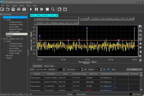 Используя S1210 EMI Pre-compliance Software совместно с анализатором спектра RIGOL можно выполнять тестирование электромагнитного излучения. С их помощью можно измерить амплитуду помех от силового кабеля, используя эквивалент сети (LISN), и выполнить автоматическую коррекцию амплитуды, загрузив корректирующий фактор (предварительный усилитель, аттенюатор, антенна, кабель или массив коррекции).