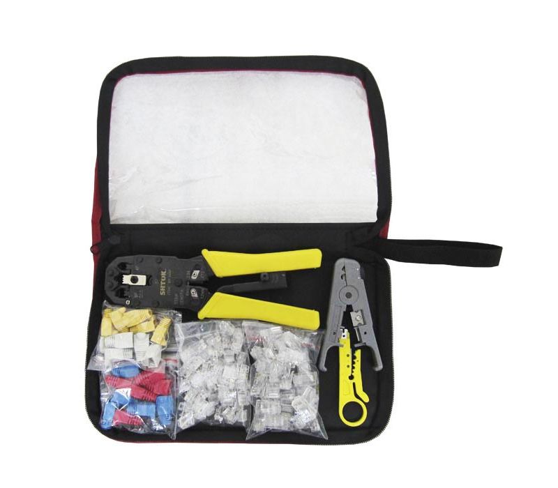 В состав набора входят инструменты для зачистки, обрезки проводов и кабелей, стриппер, обжимные клещи(кримпер), разъемы RJ45 и RJ11 с защитными колпачками. Набор упакован в компактный пластмассовый кейс.