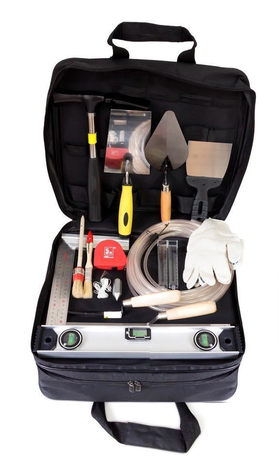Набор каменщика состоит из 14 необходимых инструментов и приспособлений, в том числе расшивок, мастерков, шпателя, молотка, отвеса, гидроуровня, рулетки и кисти.