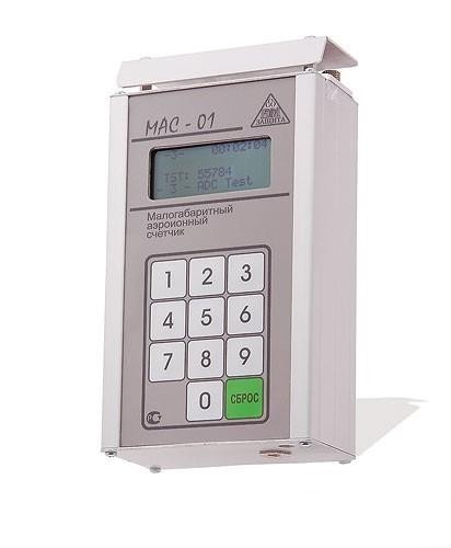 Конструктивно счетчик МАС-01 выполнен в виде малогабаритного переносного прибора с автономным питанием от аккумуляторной батареи (6 элементов типа GP 85 ААК). Основным узлом счетчика МАС-01 является аспирационная камера, сочлененная с вентилятором и предусилителем. Управление режимами работы, обработка информации и индикация результатов на цифровом табло осуществляется с помощью встроенного микропроцессора.